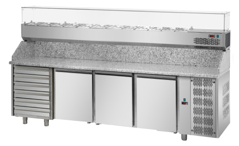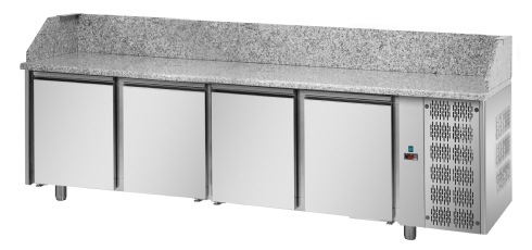 Intérieur et extérieur en Acier Inoxydable, sauf le fond extérieur en Acier Galvanisé. Angles intérieurs arrondis. Isolation en polyuréthane sans CFC injecté à haute pression. Épaisseur d’isolation: 40 mm. Portes avec fermeture automatique et joints magnétiques. Panneau de commande frontal électronique avec sonde NTC. Réfrigération ventilée. Groupe « monobloque » extractible et tropicalisé standard (température ambiante +43°C / taux d’humidité 65%) à gaz réfrigérant R404A/R507. Dégivrage et évaporation de l’eau de condensation automatiques. Pieds en Acier Inoxydable réglables. Plan de travail en granite avec sous plan isolant. Le tour à pizza peut être complétée d’une Vitrine Réfrigérée en Acier Inoxydable et groupe logé indépendant. Différentes personnalisations disponibles au catalogue.
