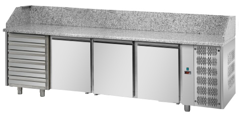 GN 700 - Meuble réfrigéré pour clayettes et bac GN 1/1. Profondeur 700 mm. Le tour à pizza peut être complétée d’une Vitrine Réfrigérée en Acier Inoxydable et groupe logé indépendant. Accessoires standard : 1 clayette plastifi ée Rilsan GN 1/1 avec 2 glissières en Acier Inox à “L” par porte. Sous plan isolant. 1 bac en plastique 600x400 mm pour chaque tiroir neutre.
